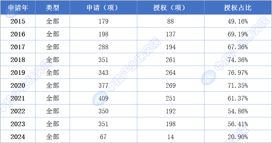 展示該技術(shù)領(lǐng)域逐年公開(kāi)的專利申請(qǐng)量、授權(quán)量及對(duì)應(yīng)授權(quán)率(當(dāng)年申請(qǐng)的專利授權(quán)量/當(dāng)年申請(qǐng)量)。申請(qǐng)量較多的年份為該技術(shù)領(lǐng)域熱度較高的年份,申請(qǐng)趨勢(shì)上升可以反映該技術(shù)領(lǐng)域研發(fā)投入呈上升趨勢(shì)。由于發(fā)明授權(quán)的周期長(zhǎng),專利公開(kāi)具有延后性,因此近2-3年的申請(qǐng)量和授權(quán)率可能偏低。