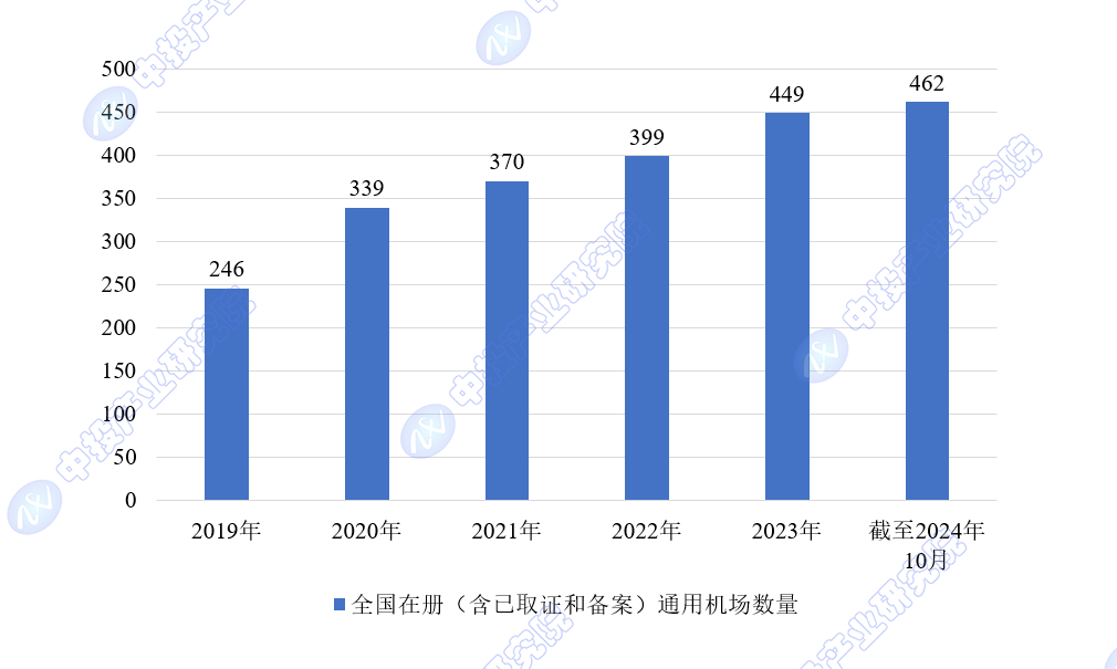 圖表:2019-2024年全國在冊(含已取證和備案)通用機(jī)場數(shù)量